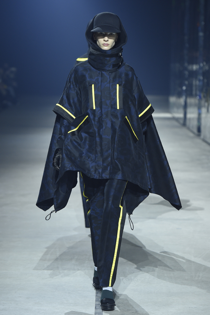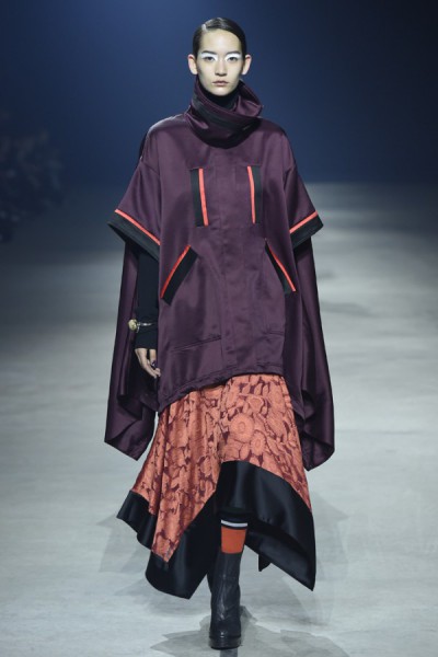 This collection was marked by standout pieces of protective ponchos and capes, with stripes and floral prints camouflaged into matching separates. Skirts flowed over tailored pants and suit separates were accentuated by fringe detailing. Less-cluttered pieces included pleated A-line chiffon dresses, shearling moto jackets, and lace embroidery. Accessories included colorblock tube socks, bright barrel and tote bags, snakeskin boots, wide-frame black shades, and cool caps.