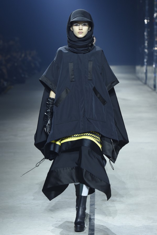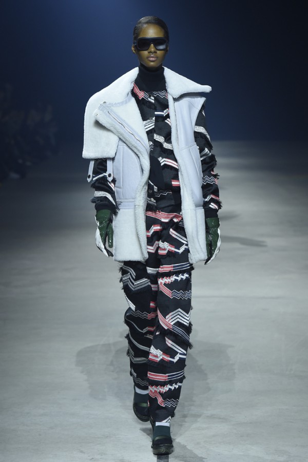 Kenzo‘s Fall 2015 collection stayed true to form with a bevy of graphic prints and eccentric accents, pieced together in thick layers perfect for weathering the harsh climates. Front row onlookers, including Kelly Rowland and Kristina Bazan, were serenaded by indie dance-pop band Saint Etienne as models appeared in front of rectangular mirrored pillars.