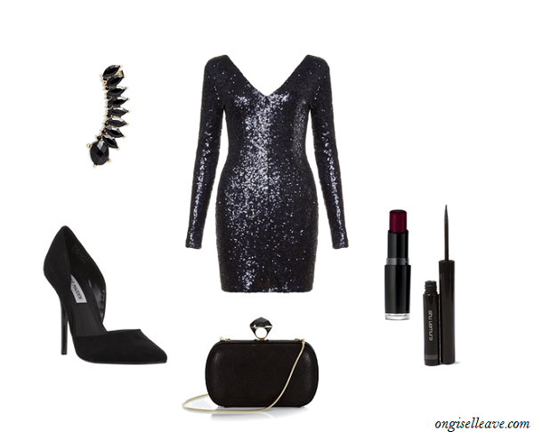 Dress: Sistaglam Long-Sleeve Sequin Bodycon Dress | Heels: Steve Madden Varcitty Pointed Court Shoes | Ear Cuff: Jules Smith Camden Ear Jacket | Handbag: DVF Powerstone Leather Clutch | Eyeliner: Shu Uemura Metal Ink Liquid Eyeliner in Black | Lipstick: Wet n’ Wild Mega Last Lip Color 919B