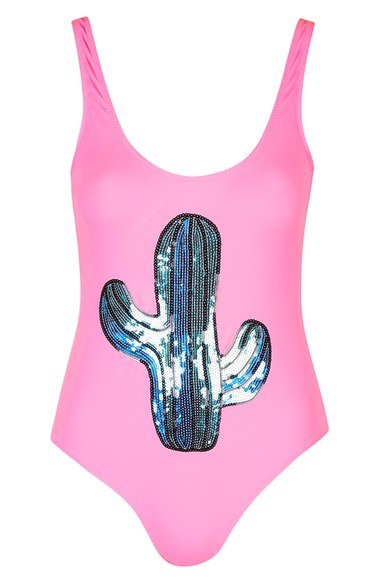 Because I love to make a statement, any one-piece that has a graphic or witty phrase is the one for me. Get into this hot pink swimsuit with a sequined cactus for a show-stopping beach look.