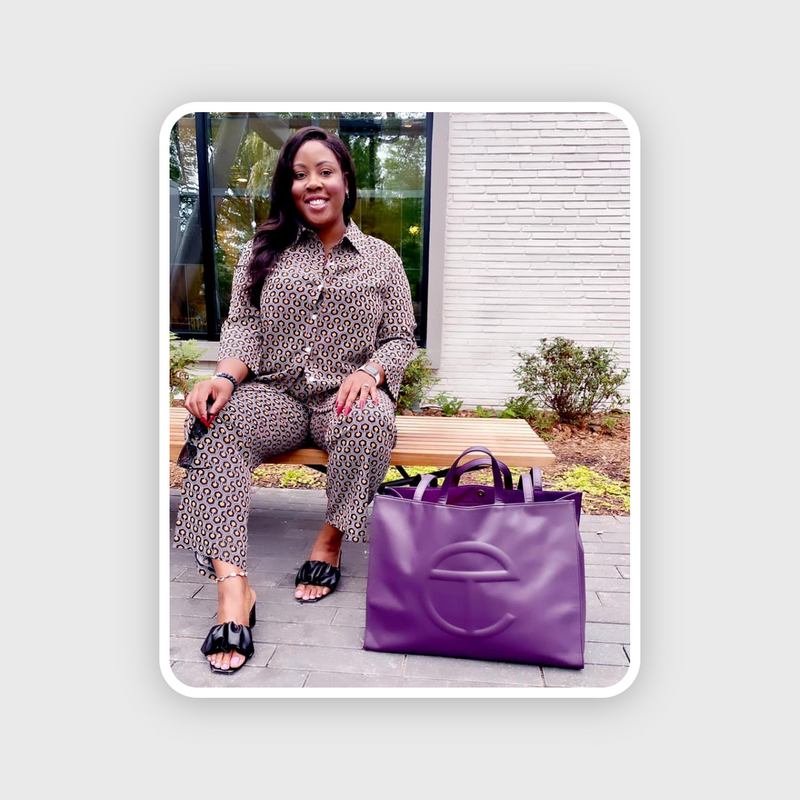 My inspiration behind my first project, titled, BeYoSelf by Goddess Giselle, was to encourage you to simply be yourself. I am wearing a custom African-print set, dark black shades, black open-toe sandals, an anklet, and carrying one of my favorite accessories, the Large Eggplant Shopping Bag by Telfar, a black-owned luxury brand, founded by a Queer Black Man and current fashion Icon, based out of NYC.